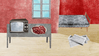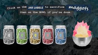 This short game is controlled with the mouse. Click on items (tv, newspaper etc...) to interact with them. Clicking on maggots will catch and add them to your pool. At the end of each day you'll be asked to sacrifice maggots. The numbers on the jar label indicate the amount of maggots that you have, the number on the bowl how much you'll have to sacrifice. HINT: You don't have to meet a demand every time if you think it's very high. You can fail a bunch of times before you'll get punished.